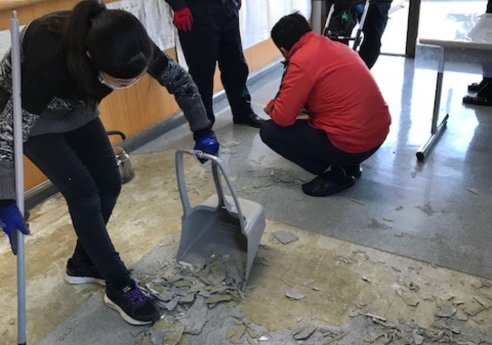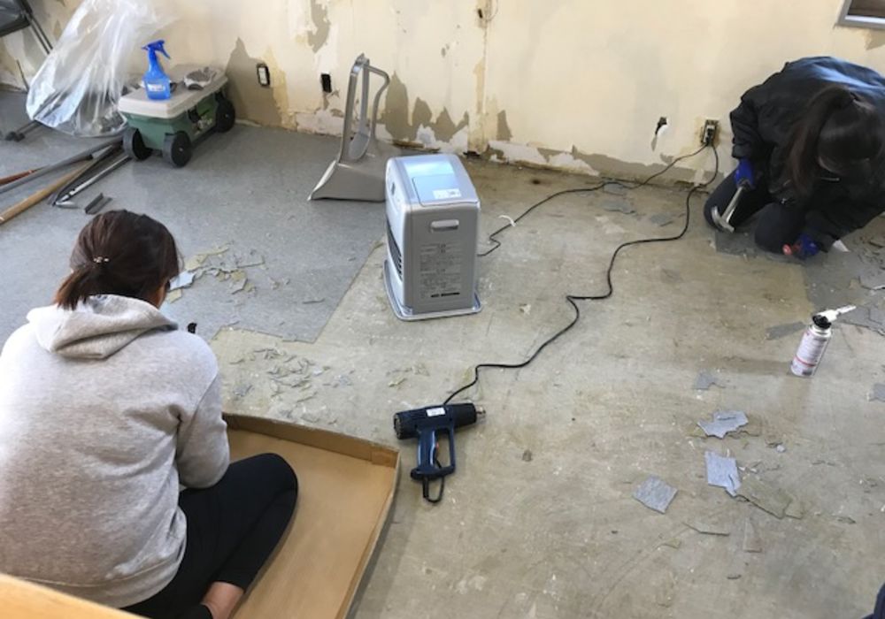 さて、まず床のフロアタイルを剥がしてみよう・・・