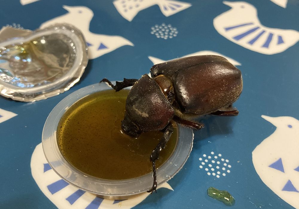 今年は昨夜はじめて一匹のカブト虫(♀)が飛来しましたlaugh